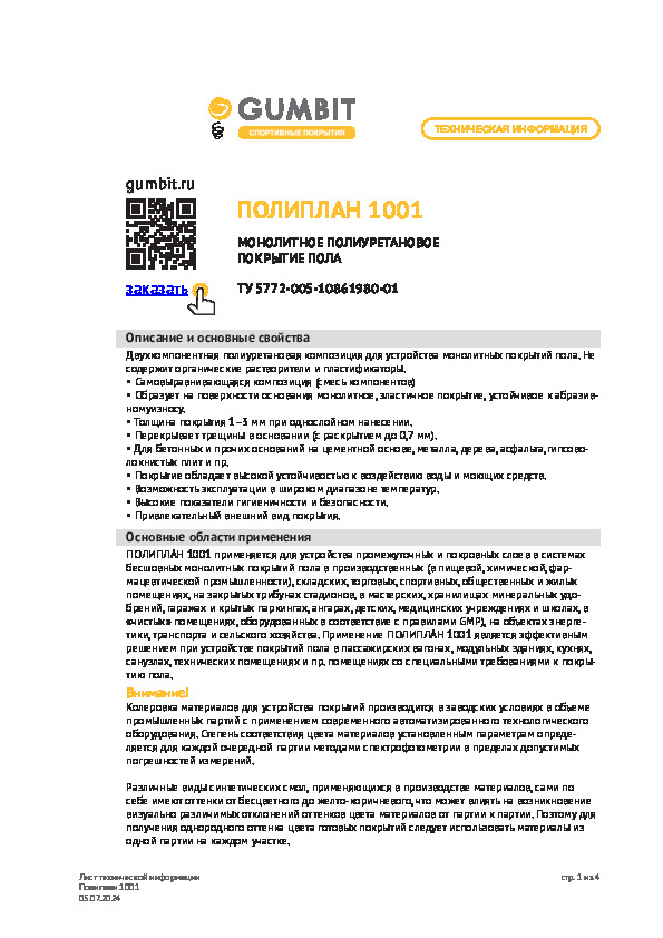 Самовыравнивающаяся полиуретановая композиция. Предназначена для устройства монолитных напольных покрытий в промышленных, технических и складских помещениях. Защищает основание от абразивного износа, перепада температур.
